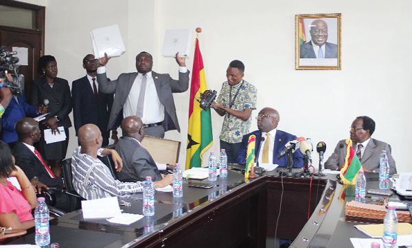 Mr Godwin Gadikor (hands raised), Senior Planning Officer of the Ministry of Railways Development, displaying the tender documents at the meeting. Looking on are Mr Joe Ghartey (2nd right), Minister of Railways Development, Mr Pingrenoma Zagre (right), the Burkina Faso Ambassador to Ghana, and other officials. Picture: GABRIEL AHIABOR