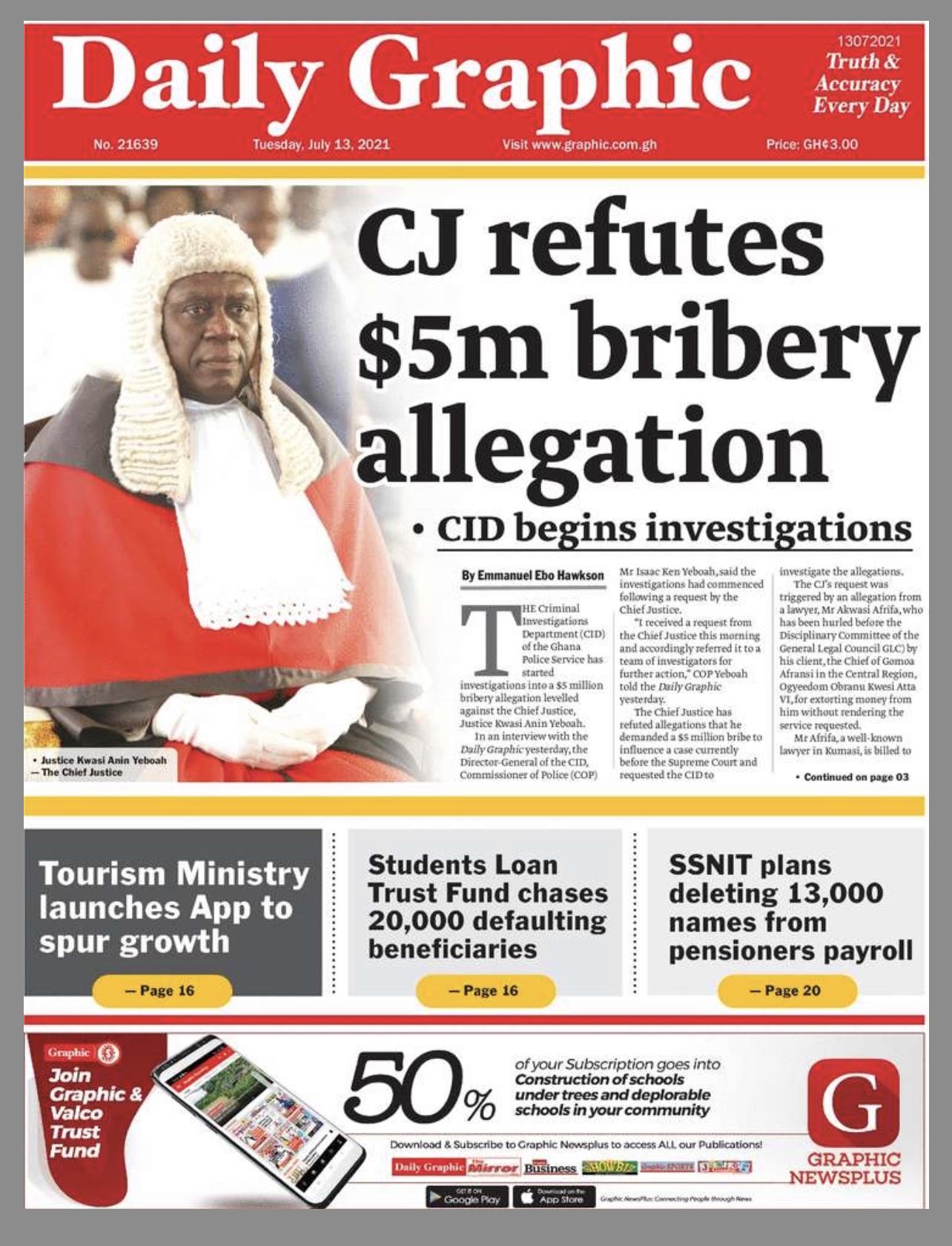 The bribery allegations levelled against the Chief Justice are in relation to a land case filed by Ogyeedom Atta VI (plaintiff), against Ghana Telecommunications Limited (first defendant), and the Lands Commission (second defendant).