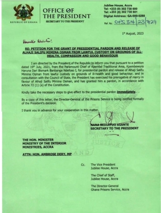 The letter explained that the presidential pardon followed a petition from the Paramount Chief of Kpembi Traditional Area, Kpembewura Haruna Dari Bismark Banbange Ndefoso I.