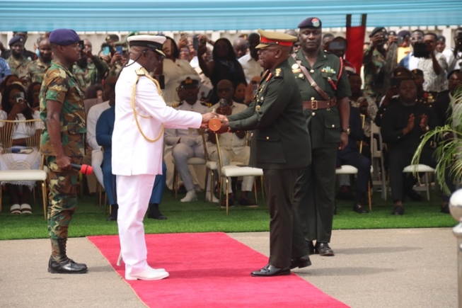 Vice Admiral Amoama officially handed over the command baton to Major General Thomas Oppong-Peprah, signifying a successful transfer of authority.