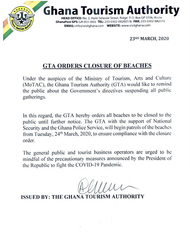 The Ghana Tourism Authority (GTA) has ordered the immediate closure of all beaches across Ghana as part of measures to help prevent the spread of the Coronavirus disease (COVID-19).