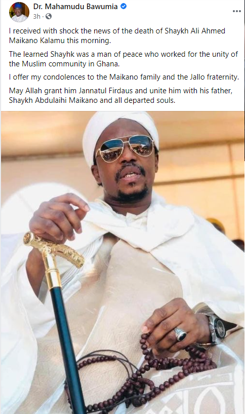 "I received with shock the news of the death of Shaykh Ali Ahmed Maikano Kalamu this morning. The learned Shayhk was a man of peace who worked for the unity of the Muslim community in Ghana,"Dr. Bawumia wrote.