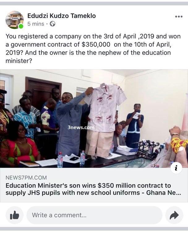 The reaction follows reports on Thursday that the Minister who is also the Manhyia South Member of Parliament (MP) had awarded a $350m contract to supply the new school uniforms for JHS pupils launched by the Ghana Education Service (GES) on Thursday.