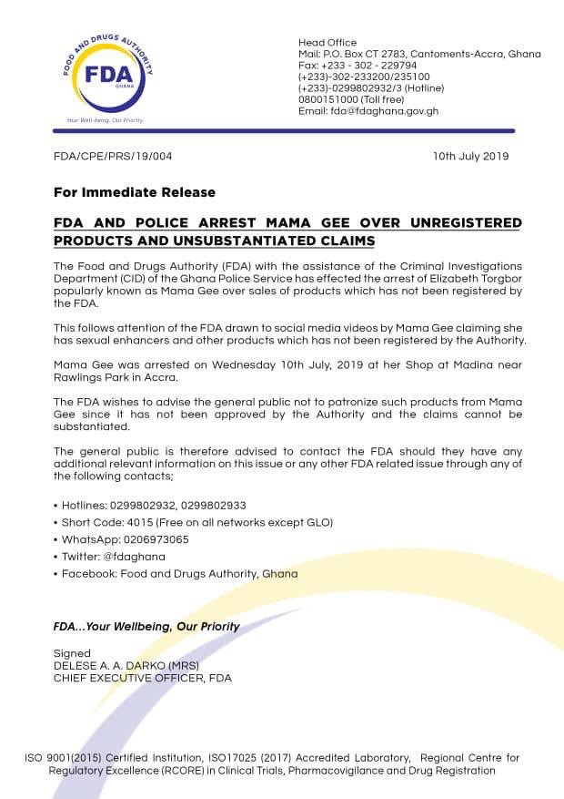 A statement signed and issued by the Chief Executive of the FDA, Mrs Delese A. A. Darko on Wednesday, July 10 said Mama Gee was arrested with the assistance of police officers from the Criminal Investigations Department (CID).