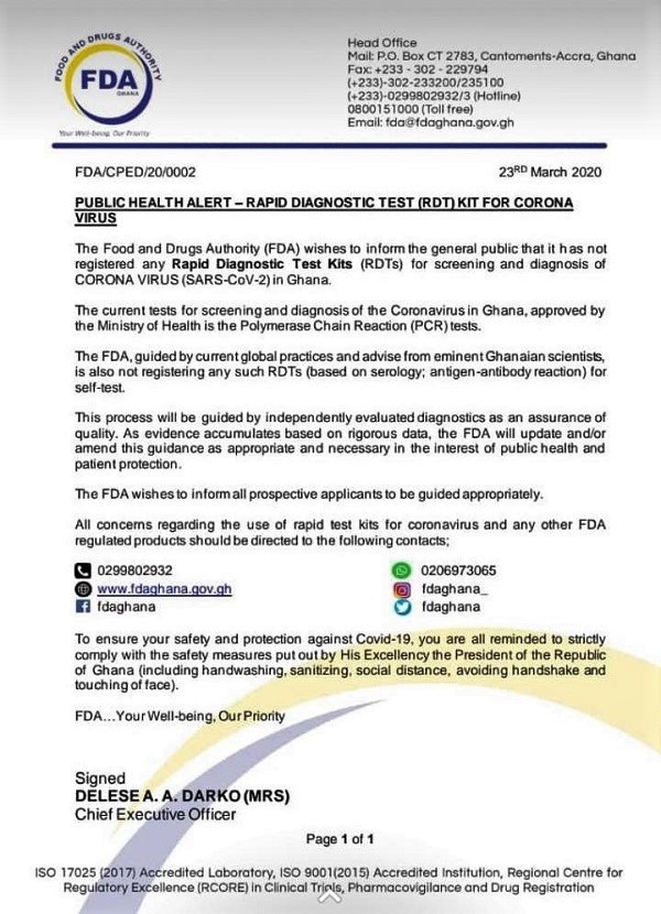 In a statement signed and issued on Tuesday [march 24, 2020] by the Chief Executive of the FDA, Mrs Delese A.A. Darko, the FDA said the only way of testing for the virus in Ghana and approved by the Ministry of Health (MoH) is the Polymerase Chain Reaction (PCR) tests.
