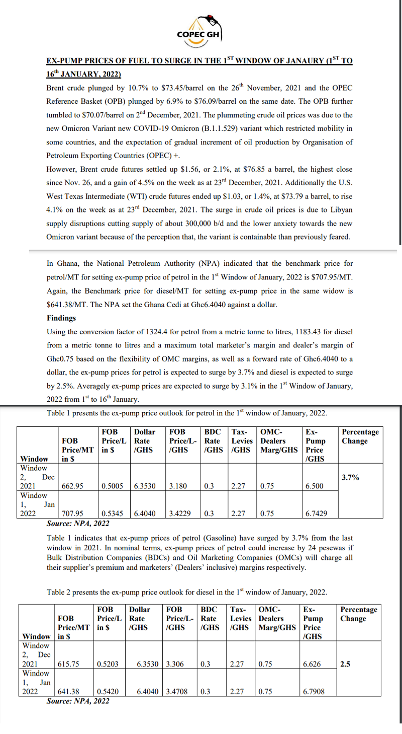 The Chamber of Petroleum Consumers (COPEC) has hinted that prices of petrol and diesel are expected to go up by 3.7% and 2.5% respectively, in the 1st Pricing Window of January.