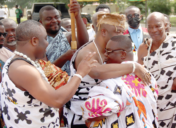The Ga king (2nd from left) embracing Nii Ayi-Bonte II (left), Gbese Mantse, after the latter had danced