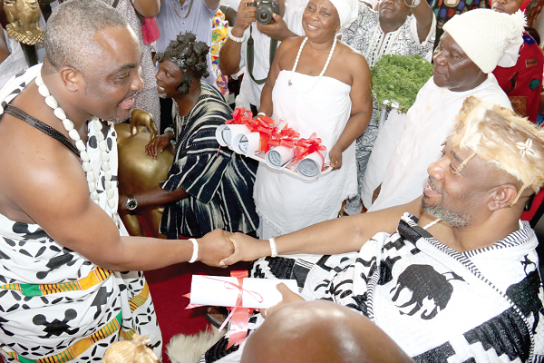 Nii Tackie Teiko Tsuru II (right), the Ga Mantse, congratulating Nii Doodu Nsaki II (left), Otublohum Mantse, after presenting his certificate to him