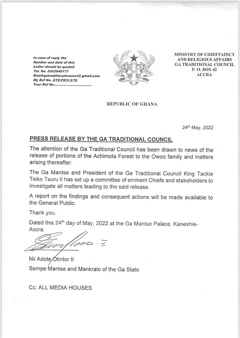 “The attention of the Ga Traditional Council has been drawn to news of the release of portions of the Achimota forest to the Owoo family….. A report on the findings and consequent action will be made available to the General public”, it added