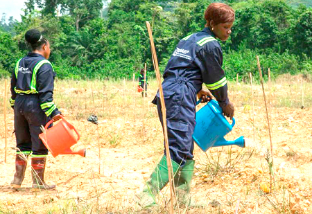 Some beneficiaries of the NAELP reclamation project watering economic trees planted on reclaimed lands at Asawinso in the Western North Region