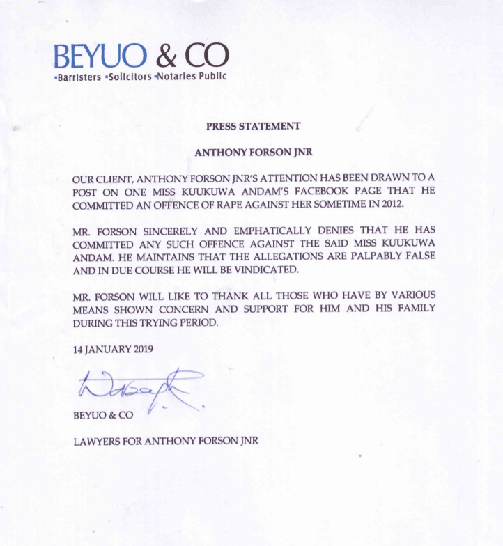 It said, “Mr Forson sincerely and emphatically denies that he has committed any such offence against Kuukuwa Andam. He maintains that the allegations are palpably false and in due course he will be vindicated.”