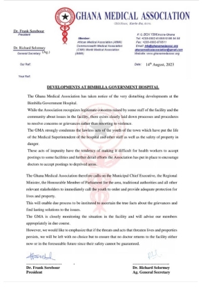 The GMA in a press statement issued on Monday, August 14, 2023, and signed by the president of the association, Dr Frank Serebour, and its Acting General Secretary, Dr Richard Selormey said “The GMA strongly condemns the lawless acts of the youth of the town which have put the life of the Medical Superintendent of the hospital and other staff as well as the safety of property in danger.