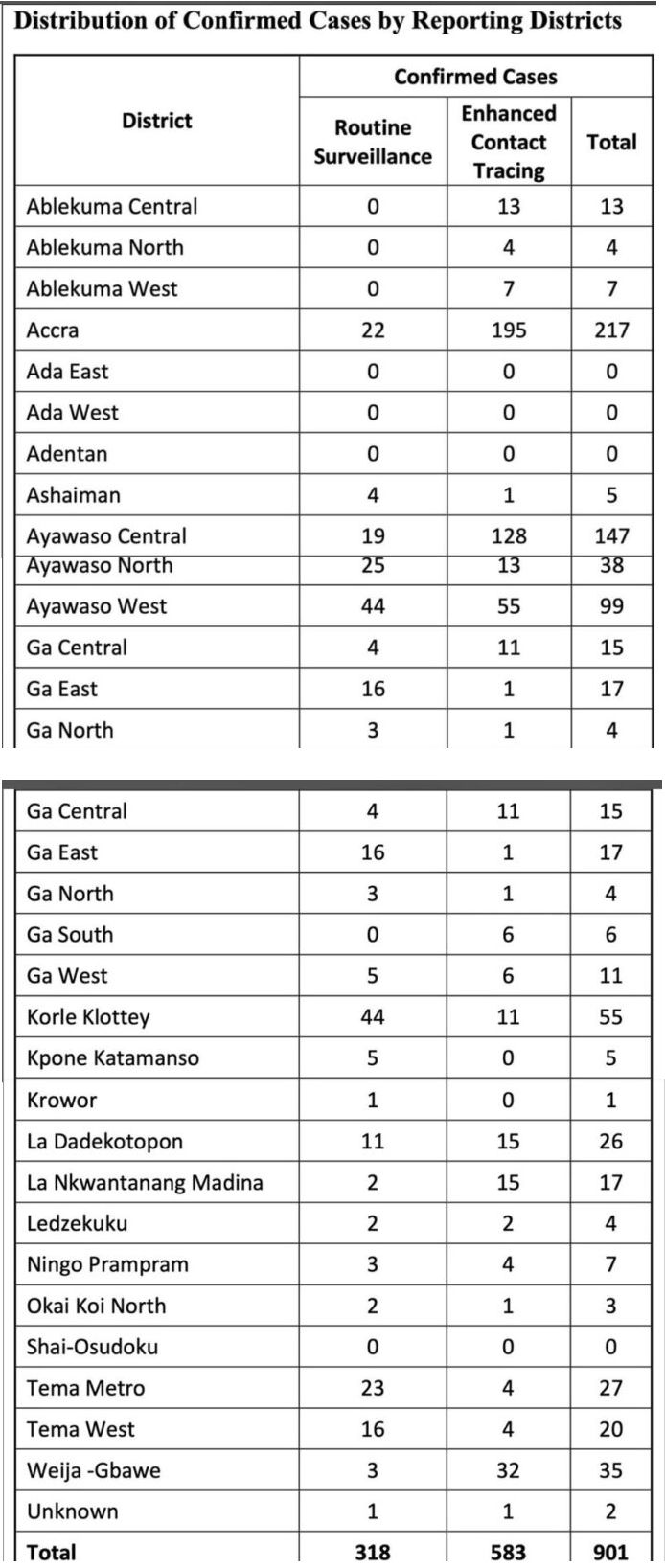 The Greater Accra Region has so far recorded 901 confirmed COVID-19 (Coronavirus) cases out of the 1,154 cases nationwide.