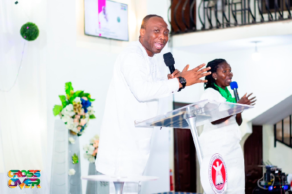 Apostle Eric Essandoh Anim Otoo (left), General Overseer of The Lord’s Pentecostal Church International, delivering his sermon during the new year service