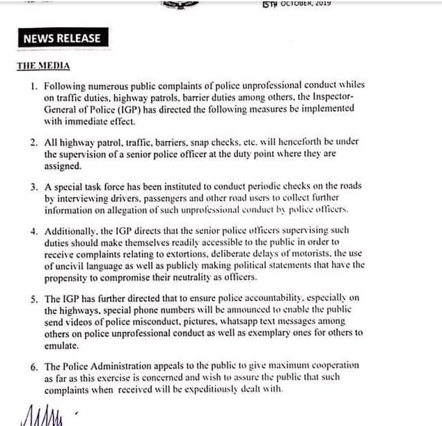 In addition, the IGP has instructed that “all the senior police officers should make themselves readily accessible to the public in order to receive complaints relating to extortions, deliberate delays of motorists, and the use of uncivil language as well as publicly making political statements that have the propensity to compromise their neutrality as officers.”