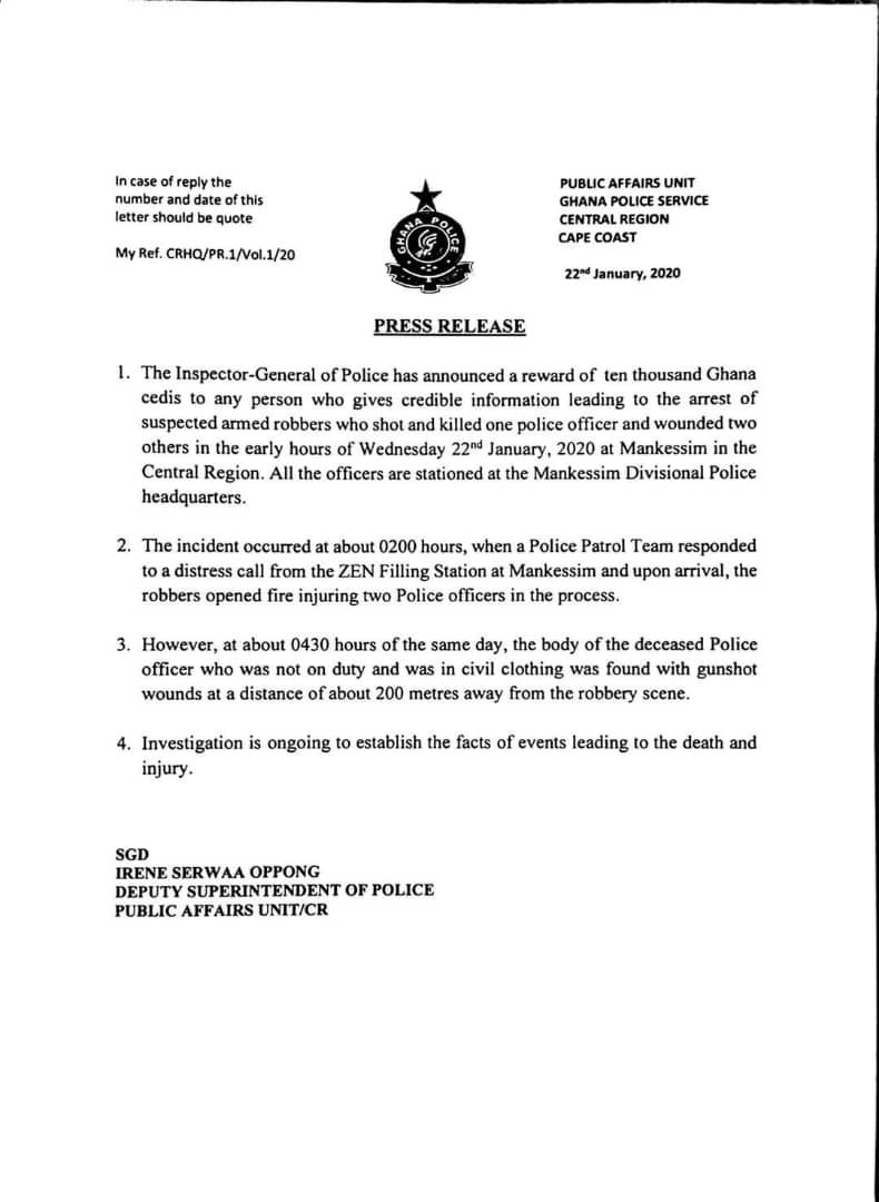 The Inspector-General of Police (IGP), Mr James Oppong-Boanuh has placed a GH¢10,000 bounty on the head of the suspected armed robbers said to have shot and killed a policeman and wounded two others on Wednesday morning at Mankessim in the Central region.