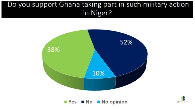 According to the research conducted between Friday, August 18, and Saturday, August 19,2023, 52 percent of respondents are opposed to sending soldiers from Ghana to Niger, 38 percent in support and 10 percent have no opinion.
