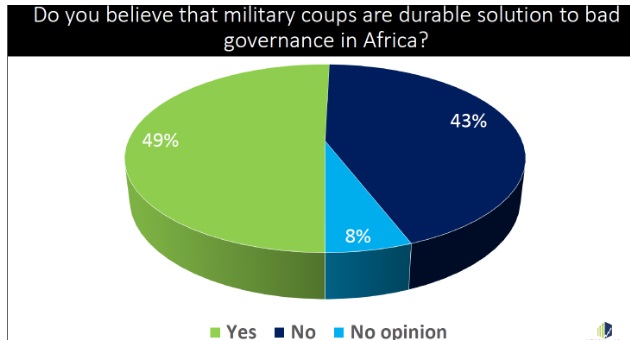 The poll also found that nearly 76 percent of the respondents share the view that coups in Africa have been occasioned by bad governance in those countries, while 17 percent do not share this view, and 7 percent have no opinion.