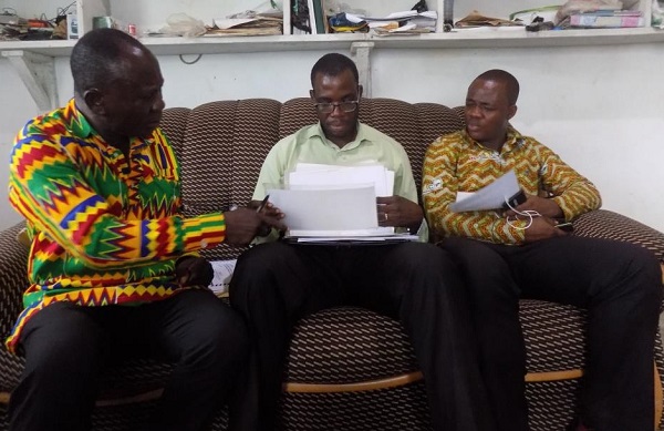 Mr Martin Daanko (middle), the Mfantseman Municipal Director of Health Services, and his colleague, Mr Emmanuel Asante-Aboagye (right), scrutinising some of Mr John Kofi Sackey’s licences. With them is Mr Samuel Kyei-Boateng, the Daily Graphic Reporter