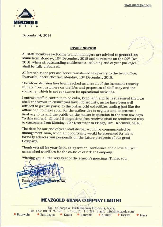 Embattled gold dealership firm, Menzgold Ghana Limited, has directed all its employees across the country to proceed on leave, effective Monday, December 10, 2018.