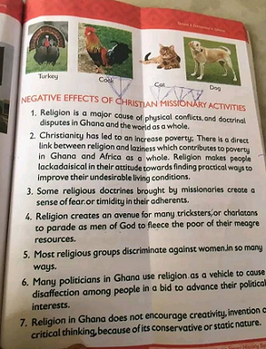 Parts of the book with the title “History of Ghana for Basic Schools – Learners’ Book Four,” which is in circulation on social media states that Christianity is responsible for poverty and that religion has incited physical conflicts in Ghana and worldwide.
