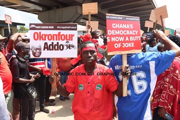 Hundreds of protesters on Tuesday morning gathered at the Obra Spot at Kwame Nkrumah circle in Accra for the #OccupyBoGprotest being organised by the Minority side in Parliament.