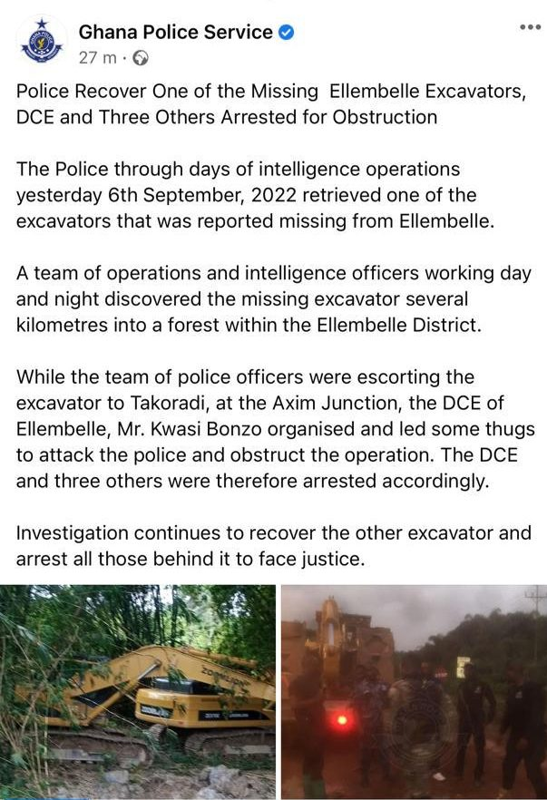 “A team of operations and intelligence officers working day and night discovered the missing excavator several kilometres into a forest within the Ellembelle District”, the police said.