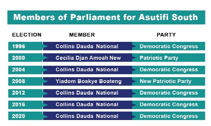 The Asutifi South Constituency, located in the Asutifi District in the Ahafo Region, so far, is the territory of the NDC, as the party’s current Member of Parliament (MP), Collins Dauda, has ensured it has remained their seat six times since 1992.