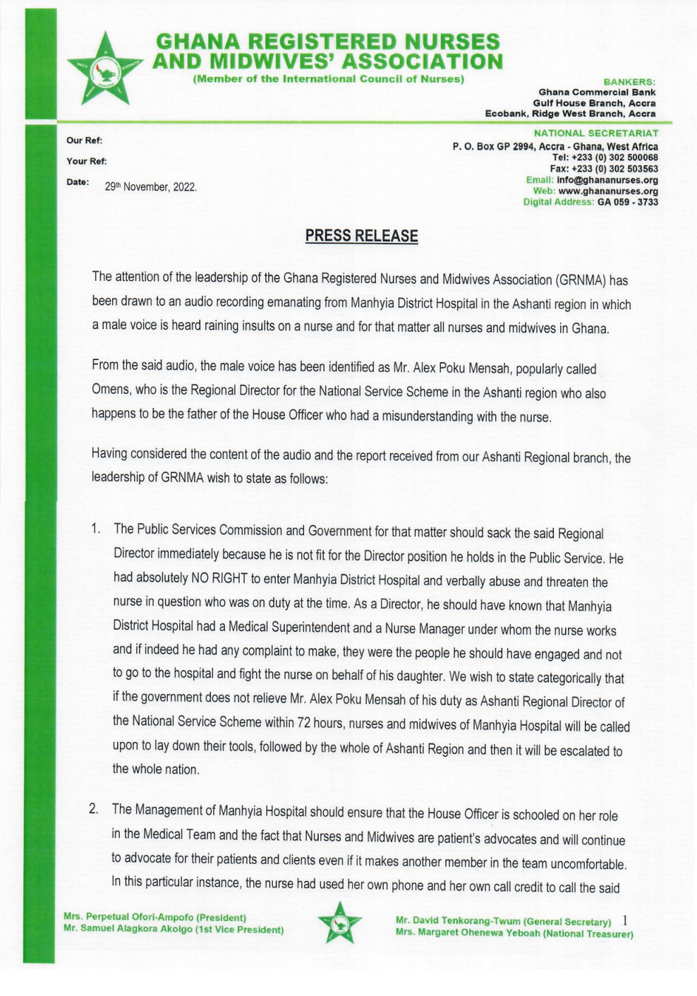 The Ghana Registered Nurses and Midwives Association (GRNMA) has called for the dismissal of the Ashanti Regional Director for the National Service Scheme (NSS), Mr. Alex Opoku Mensah for verbally assaulting a nurse at the Manhyia District Hospital.