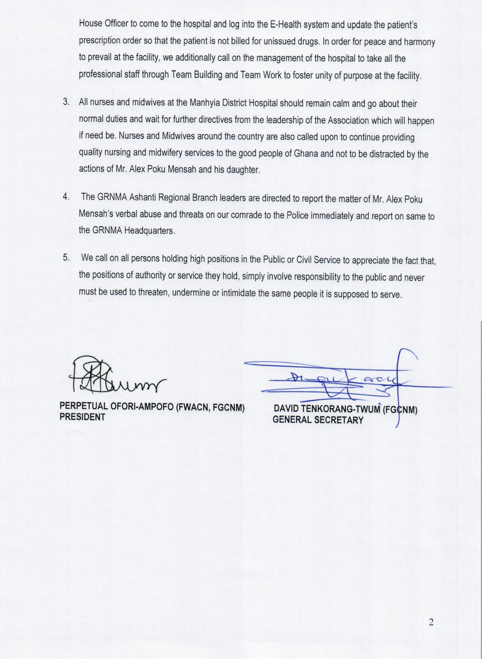 The association has therefore given the government 72 hours momentum to sack Mr. Mensah, “or all nurses and midwives at the Manhyia house hospital will lay down their tools to be followed by the whole of Ashanti, and then it will be escalated to the whole nation”, it threatened.