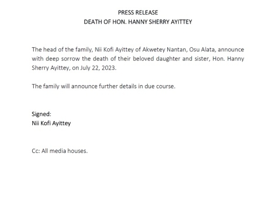 "The head of the family, Nii Kofi Ayittey of Akwetey Nantan, Osu Alata, announce with deep sorrow the death of their beloved and sister, Hon Hanny Sherry Ayittey on July 22, 2023".
