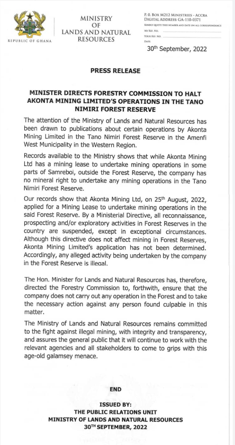 The Ministry of Lands and Natural Resources has directed mining firm, Akonta Mining Limited to stop operations in the Tano Nimiri Forest with immediate effect.