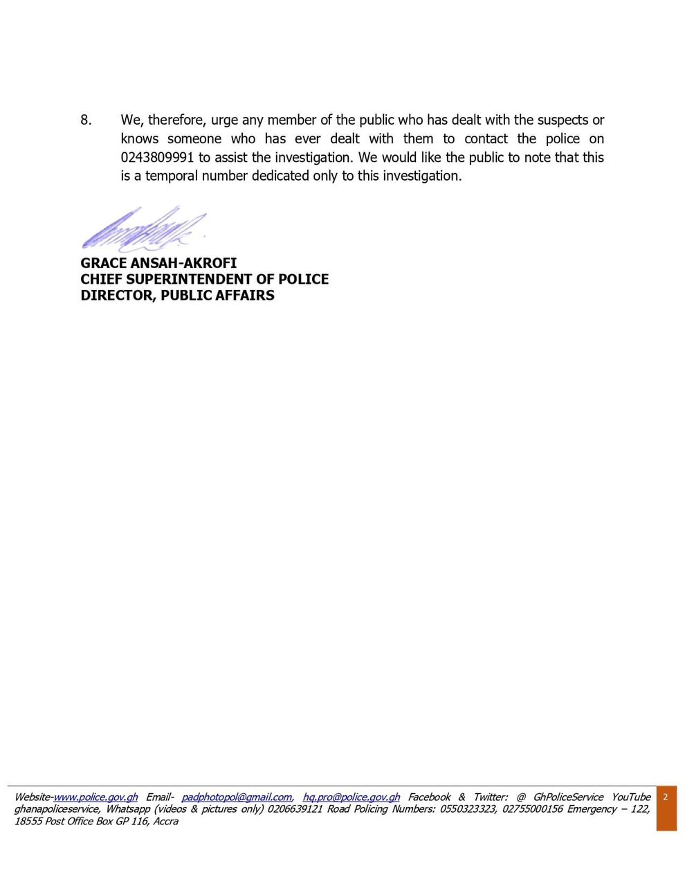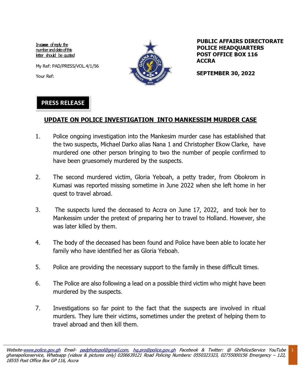 A press release issued by the Public Affairs Directorate of the Service on Friday, September 30, 2022, named the second victim as Gloria Yeboah a petty trader, from Obokrom in Kumasi.