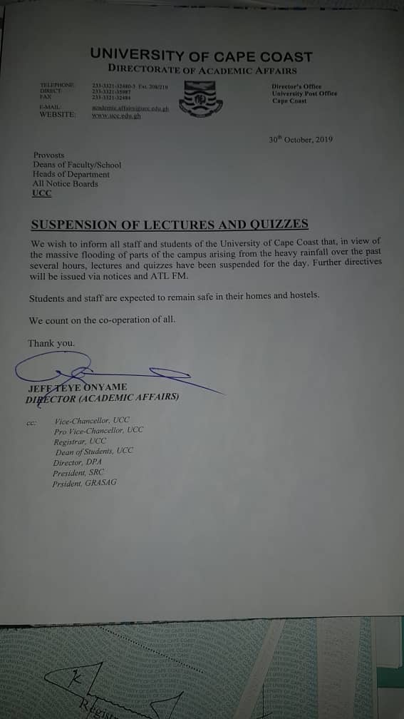 "We wish to inform all staff and students of the University of Cape Coast that, in view of the massive flooding of parts of the campus arising from the heavy rainfall over the past several hours, lectures and quizzes have been suspended for the day. Further directives will be issued via notices and ATL FM," the statement said.