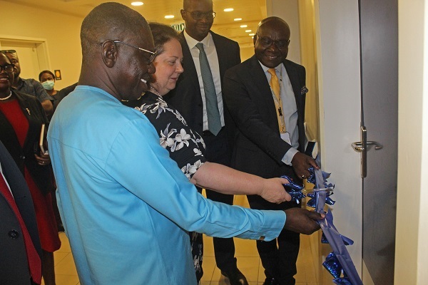 Shlomit Sufa (2nd from left), the Israeli Ambassador to Ghana, cutting the ribbon for the launch of the training centre. Assisting her are Dr Darius Osei (right), CEO of University of Ghana Medical Centre, and other dignitaries. Picture: ERNEST KODZI