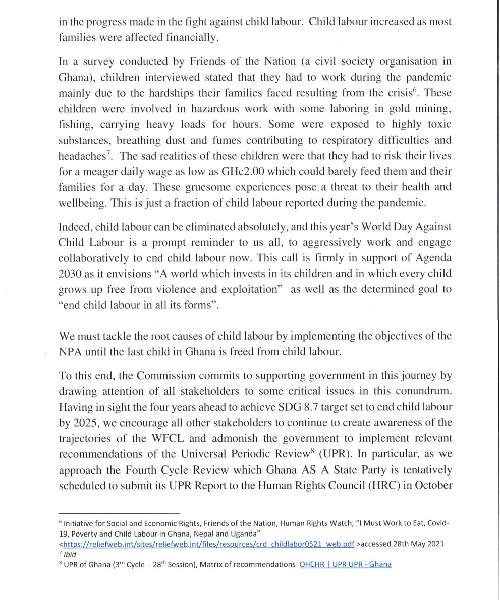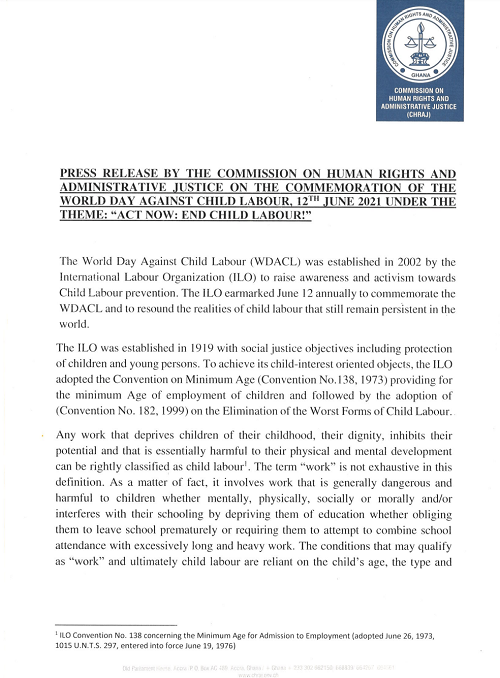 In a statement marking this year's World Day Against Child Labour, CHRAJ noted that investing in resources will ensure all children especially from households with limited or declining household incomes, the equal opportunity to access quality education and be protected from physical and psychological abuse.