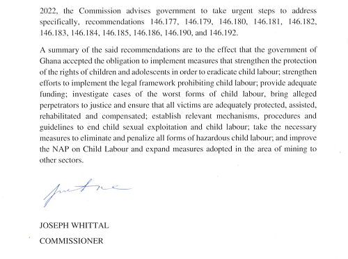 The statement signed by the Commissioner of CHRAJ, Mr. Joseph Whitall, said "The government of Ghana is entreated to ratify the UN CRC Optional Protocol on the Sale of Children, Child Prostitution and Child Pornography to help protect children from commercial sexual exploitation; which is categorized as a worst form of child labour", he added.