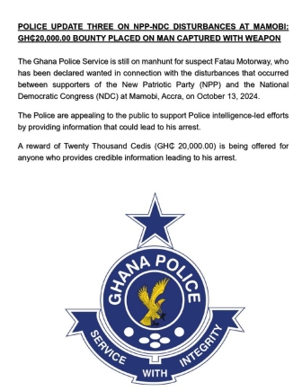 The Ghana Police Service has placed a Gh¢20,000 bounty on credible information leading to the arrest of Fatau Motorway, one of the suspects in last week's clash at Mamobi in Accra between supporters of the National Democratic Congress (NDC) and New Patriotic Party (NPP).