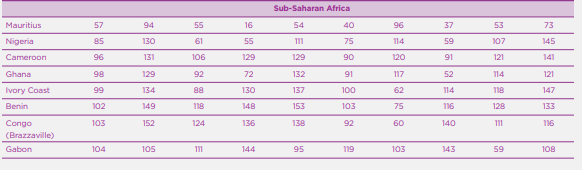 In the Sub-Saharan African ranking, Ghana placed fourth behind Mauritius (57), Nigeria (85) and Cameroon (96) in the top five which was completed by neighbours Ivory Coast (99).