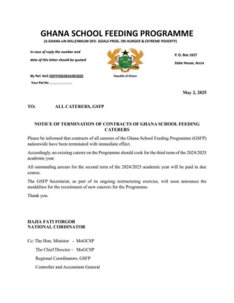 In an official statement dated May 2, 2025, the GSFP directed that no current caterer should provide meals for the third term of the 2024/2025 academic year.