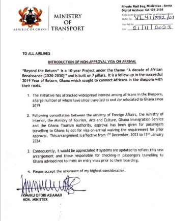 The Government of Ghana through the Transport Ministry has declared the reinstatement of the visa-on-arrival policy for passengers traveling to Ghana during the coming festive season.