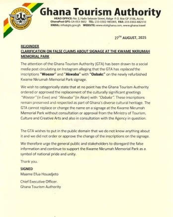 The Ghana Tourism Authority (GTA) has refuted claims circulating on social media that it has replaced the culturally significant inscriptions “Woezor” (Ewe) and “Akwaaba” (Akan) with the word “Oobake” on the signage at the Kwame Nkrumah Memorial Park.