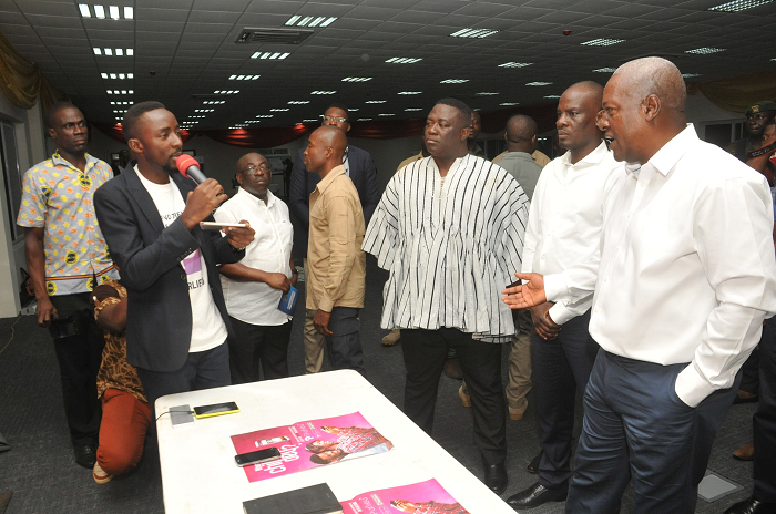 An official of Surfinn, a digital company, briefing President Mahama on the operations of the company. With them are Nii Laryea Afotey Agbo, Greater Accra Regional Minister, and Mr Haruna Iddrisu, Minister of Employment and Labour Relations. Picture: EBOW HANSON