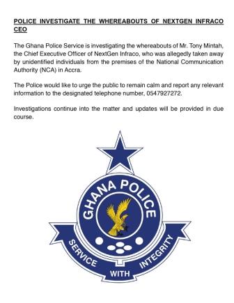 An earlier police statement issued Wednesday (October 23) afternoon said Tony Mintah "was allegedly taken away by unidentified individuals from the premises of the National Communications Authority (NCA) in Accra."