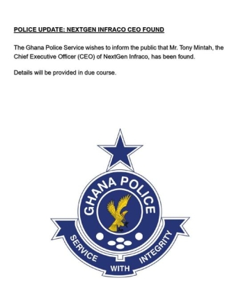 "The Ghana Police wishes to inform the public that Mr Tony Mintah, the Chief Executive Officer of NextGen Infraco has been found. Details will be provided soon," the second statement indicated.