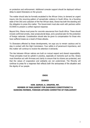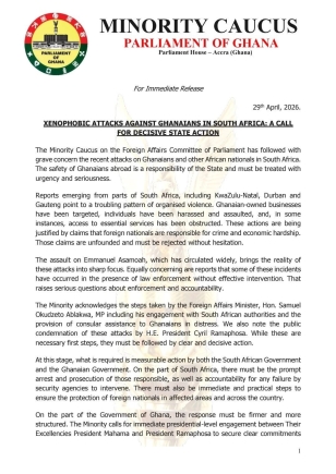 The Minority acknowledged measures already taken by the Minister for Foreign Affairs, Samuel Okudzeto Ablakwa, including his engagement with South African authorities and efforts to provide consular assistance to affected Ghanaians.
