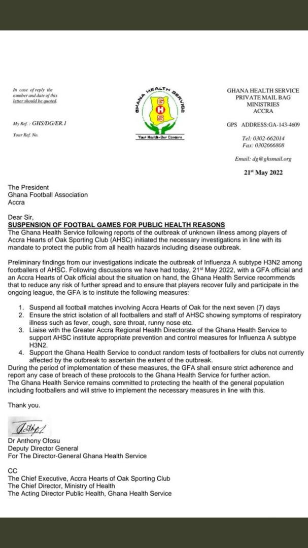 The GHS has also asked the GFA to ensure that all footballers and staff of Accra Hearts of Oak who are showing symptoms of the disease are strictly isolated.