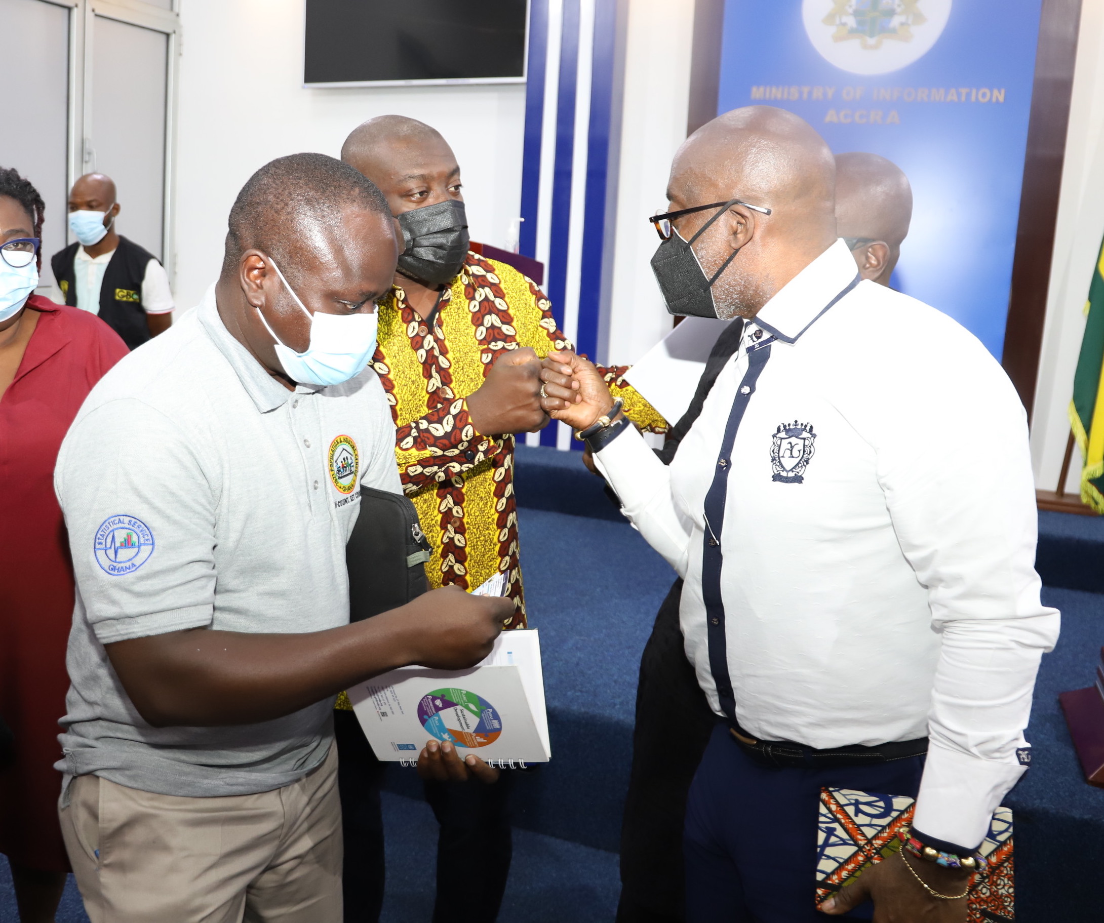 Mr Kojo Oppong Nkrumah (2nd left), Minister of Information, exchanging pleasantries with Mr Yofi Grant (right), CEO of the GIPC, after the press conference in Accra. With them is Prof. Samuel Annim (left), the Government Statistician. Picture: GABRIEL AHIABOR