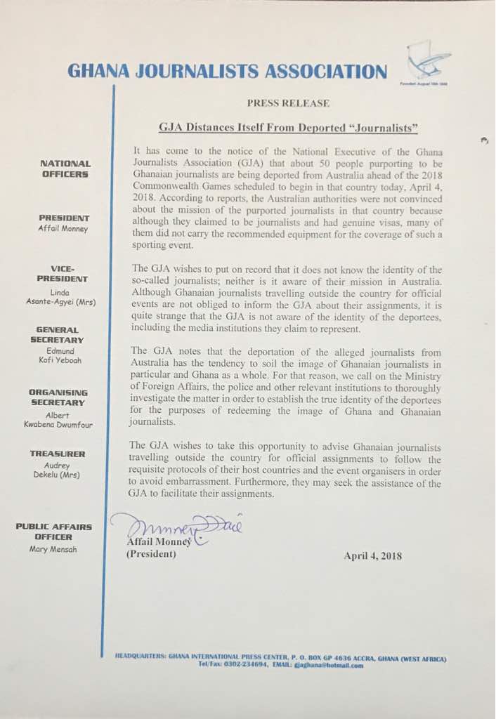The GJA in a statement reacting to the reports of 50 people purporting to be Ghanaian journalists being deported from Australia ahead of the 2018 Commonwealth Games said it does not know the identity of the so-called journalists and neither is it aware of their mission in Australia.
