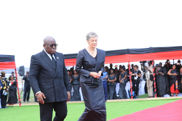 President Akufo-Addo arrived at the auditorium, accompanied by his wife, at 8.58 a.m. and went to the casket, which sat on a catafalque, to pay his last respects.
